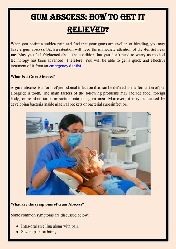 You can get the pain from the abscessed tooth that can be relieved by some simple home remedies. The home remedies can help relieve the adverse effects of pain temporarily but they can’t cure the abscess. If the pain is extensive, you may require Emergency Dental Care Near me.