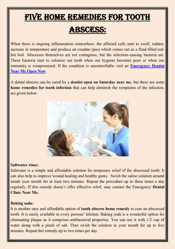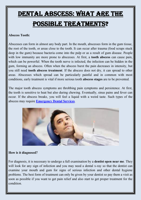 Before you see the dentist open near me, take over-the-counter painkillers such as paracetamol or ibuprofen. Once you see a dentist, to relieve the symptoms dentists usually drain the pus either through lancing the abscess or by drilling a small hole in the tooth to allow the pus to escape. Sometimes antibiotics are prescribed for a few days to clear any infection that remains. Call the best dentist near me if the pain in a tooth is severe.