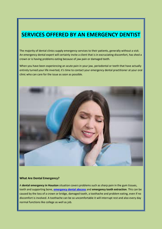 Clinical emergency occurs every once in a while, as well as take various forms. One sort of clinical emergency that most of us rarely prepare for is that of dental emergencies. This could be anything from a busted tooth, a 'spontaneous' and an excruciating toothache that creates in the middle of the night or something of that magnitude. Of course, what qualifies to be considered as an emergency oral trouble differs from one person to another. However, the truth of the subject is that many individuals are not prepared for emergency dental treatment Houston.